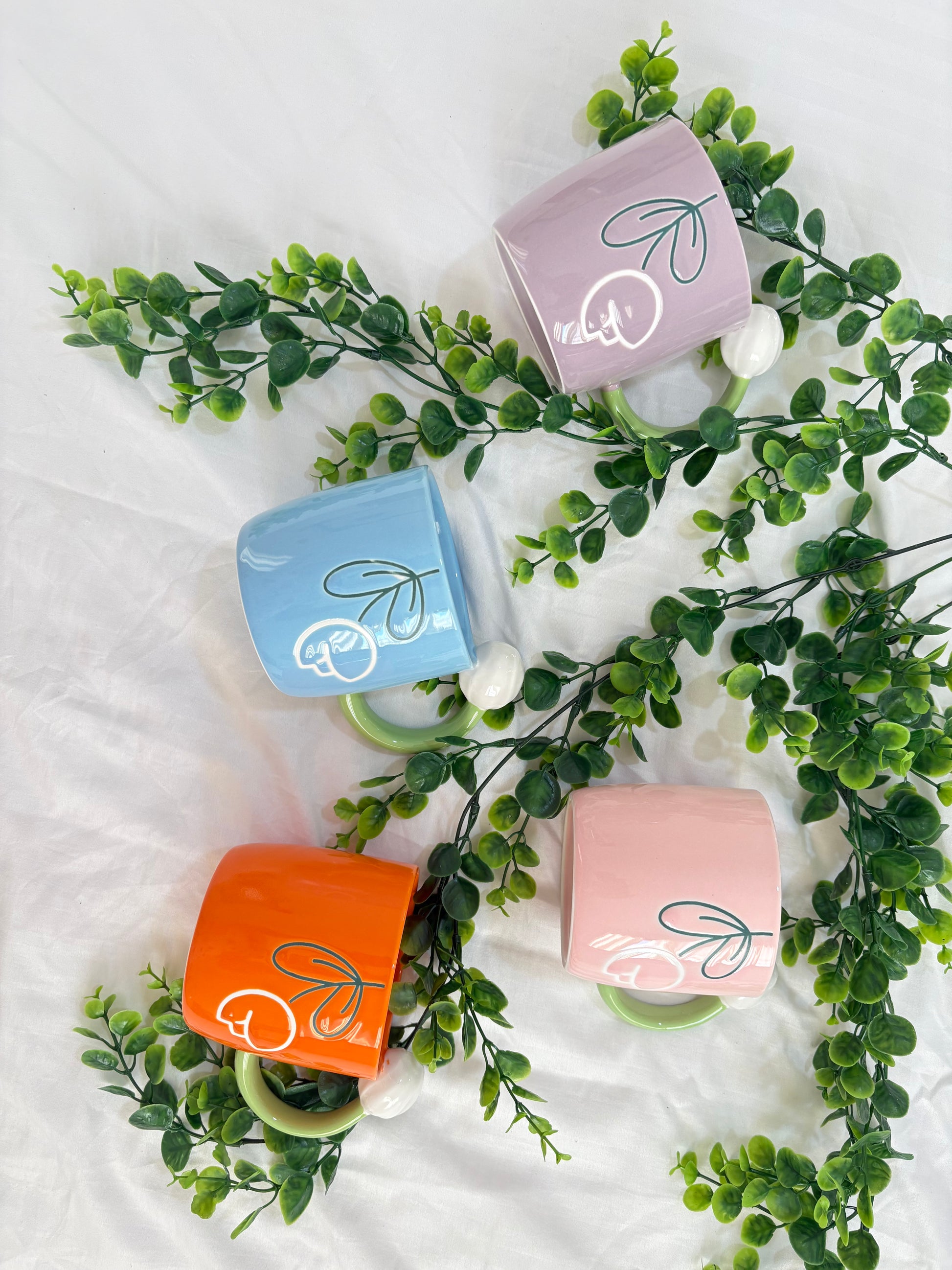 A delightful set of four ceramic mugs, each featuring a bright, matte color (pink, orange, blue, and lavender). They share a uniform design: a stylized, abstract floral or leaf outline on the side and a chunky green handle with a rounded white accent. These mugs bring a vibrant, cheerful touch to any kitchen.